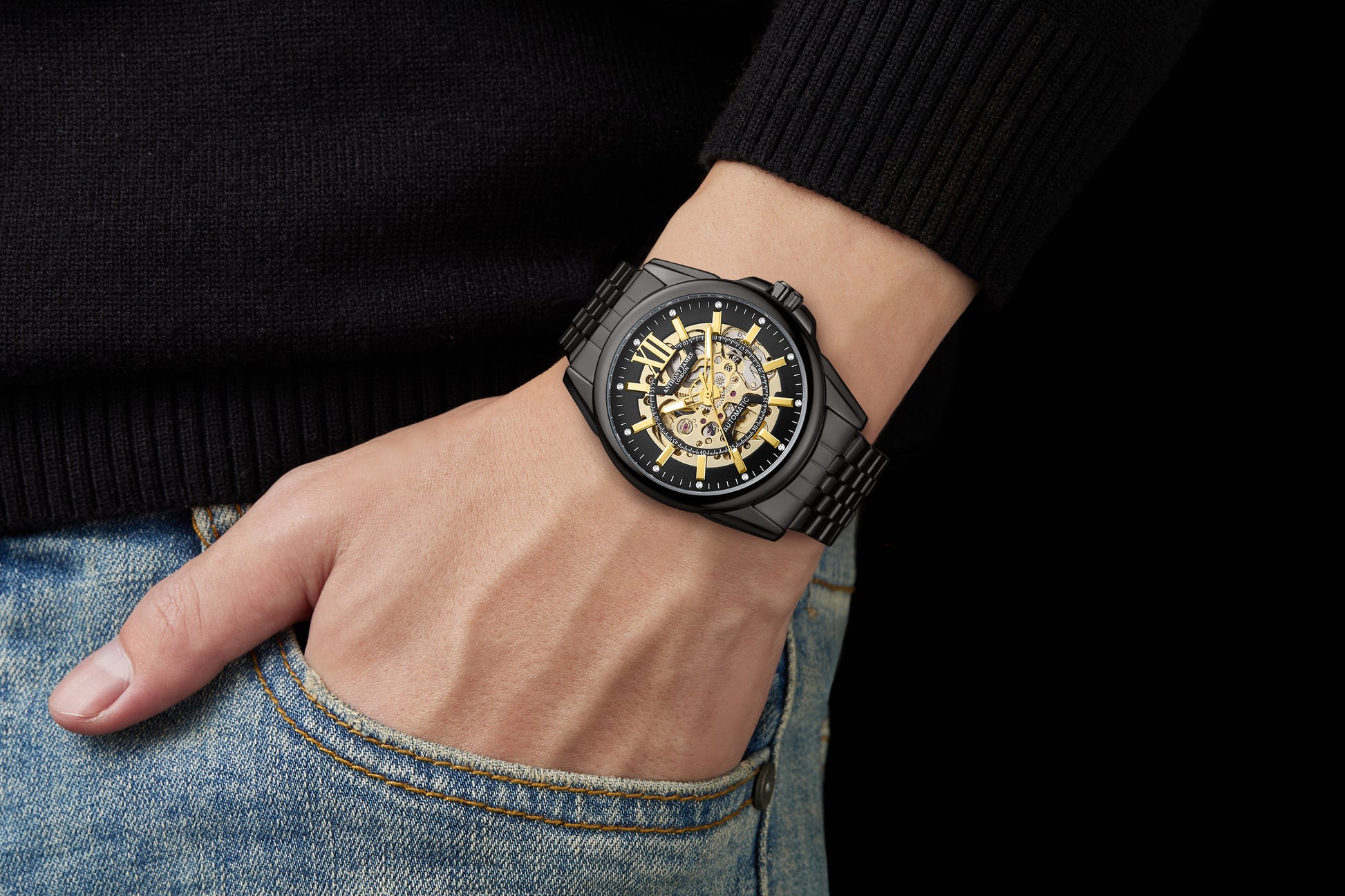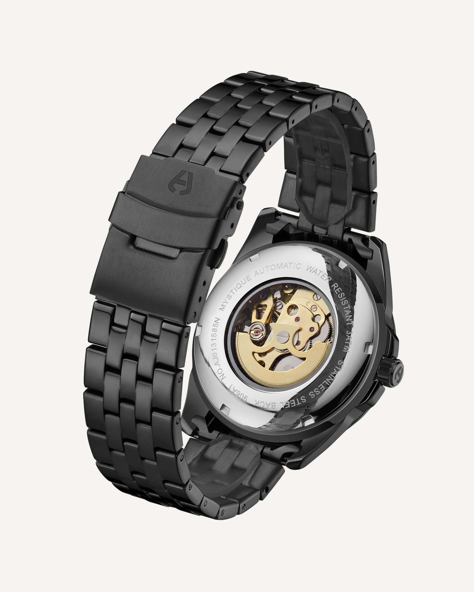 The Hand Assembled Anthony James Limited Edition Mystique Automatic Black men’s watch boasts 162 part 21 jewel movement and exhibits superb accuracy that is enhanced by the gold skeletonised dial, contrasting boldly against the black border, and this same engineering is viewable from the caseback. It is water resistant to 3ATM, while the scratch resistant mineral glass is both sophisticated and reliable. The raven black IP stainless steel bracelet secures the timepiece, which comes complete with a five-year warranty.