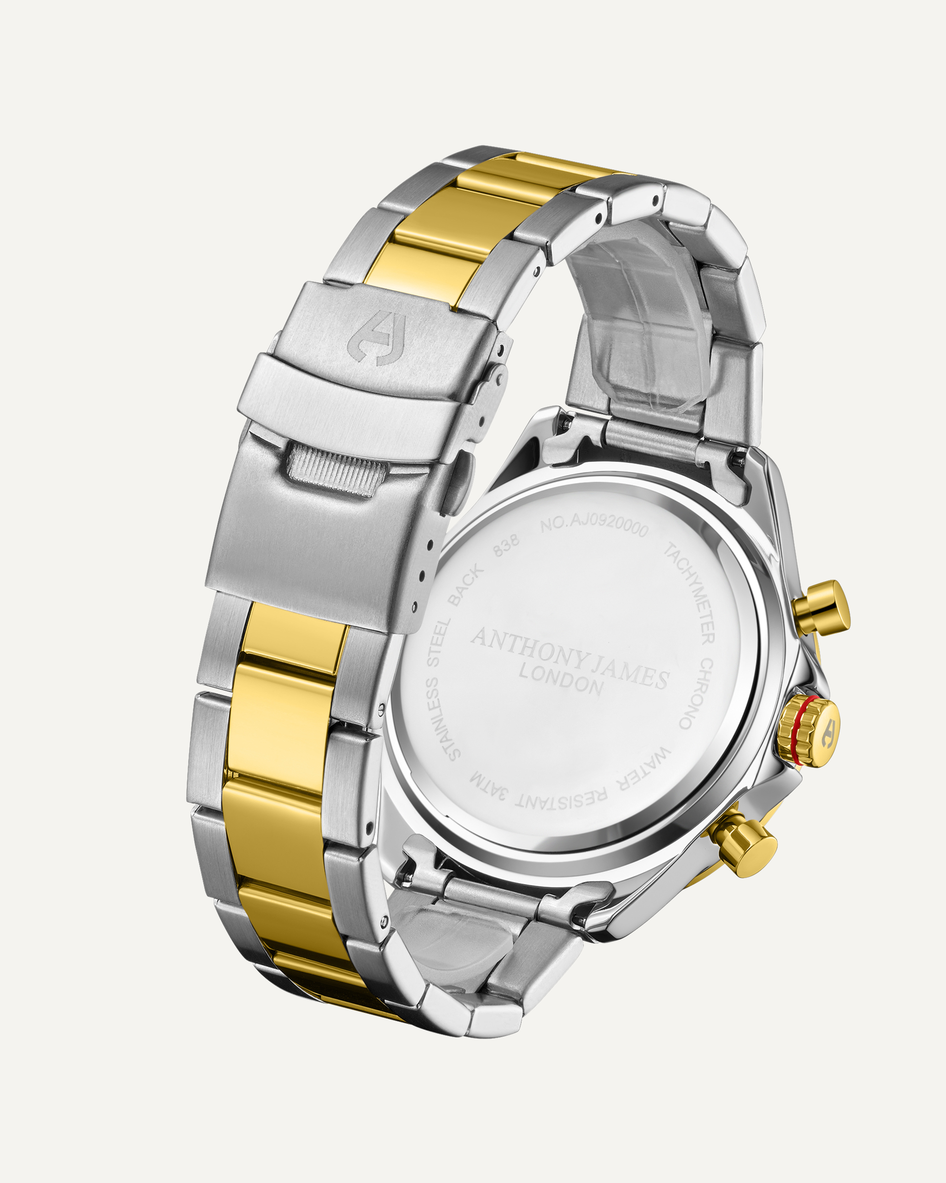 The Hand Assembled Anthony James Limited Edition Tachymeter Chrono Two-Tone Blue men’s watch boasts an array of exceptionally stylish and contemporary features ideal for gentlemen looking to enhance their look. The Quartz movement works the gold hour and minute hands that glow with white luminous features and are fitted against the sleek pacific-blue dial with UP indexes. The silver and gold alloy case is enhanced by the Tachymeter bezel to easily measure your speed based on time and distance travelled, while the 202 stainless steel bracelet with wrapped links and a secure folded clasp and 304 stainless steel caseback provide the finalising details.