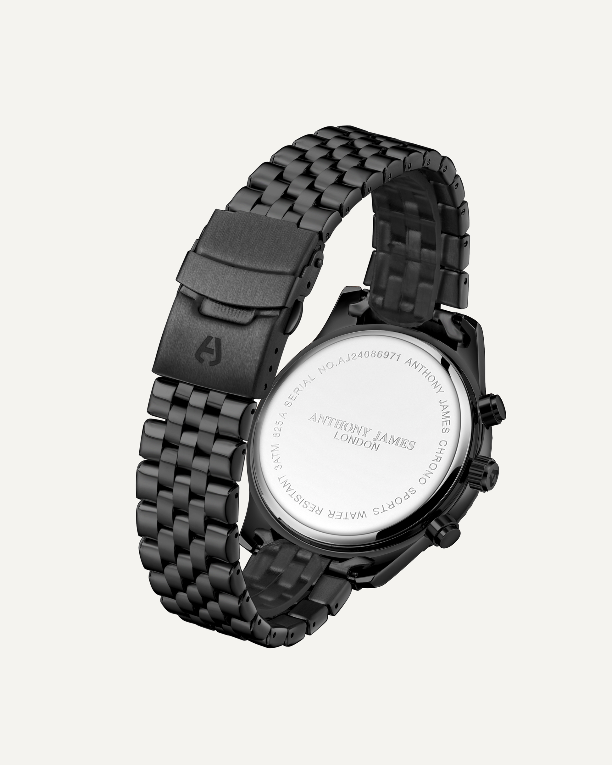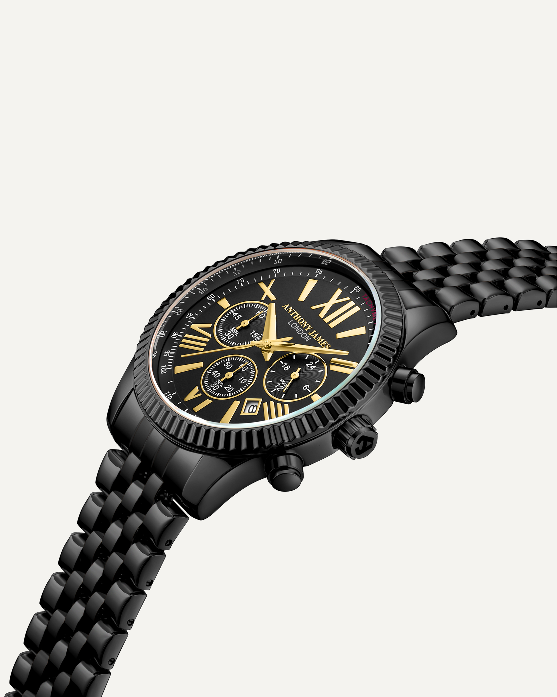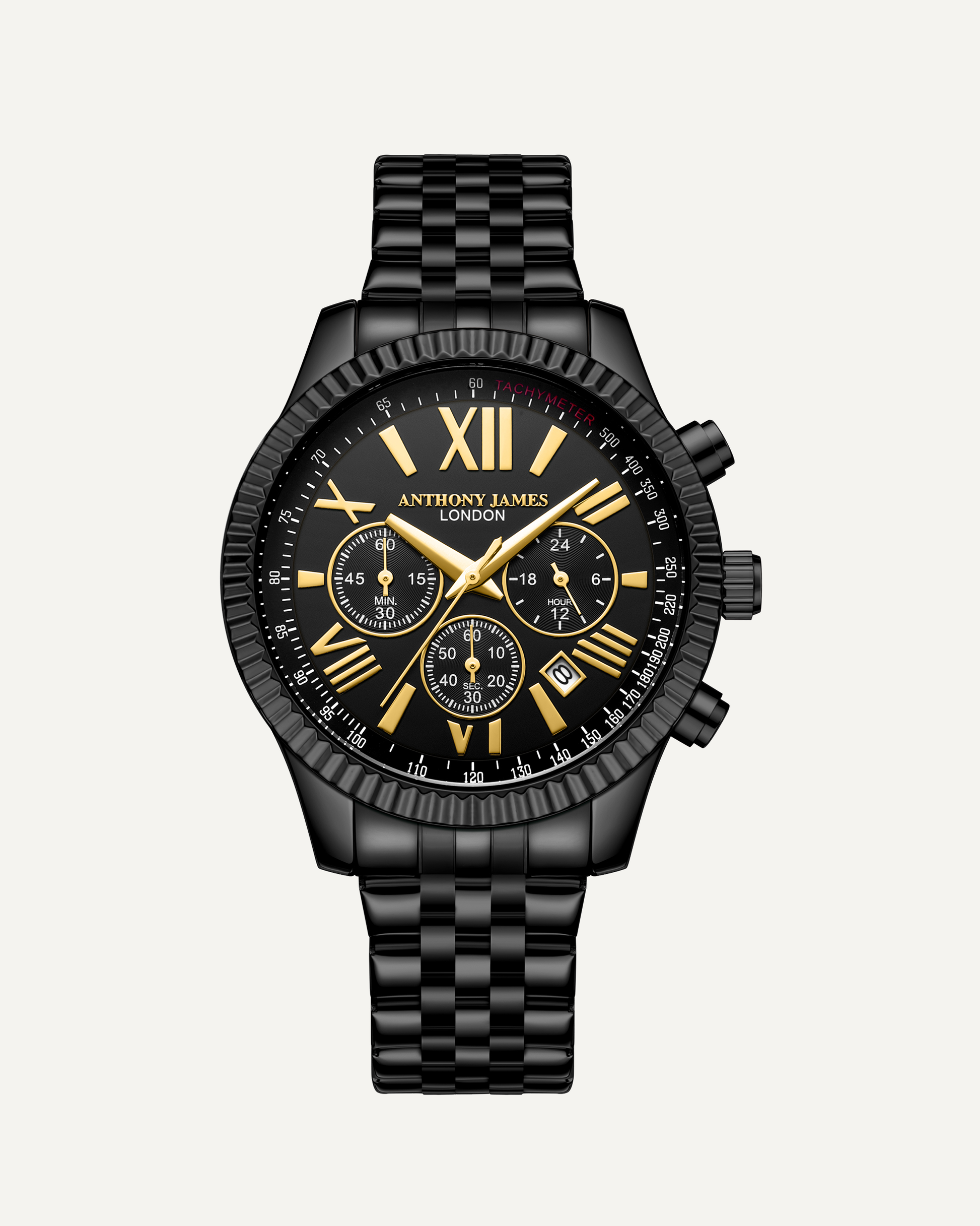 The Hand Assembled Anthony James Limited Edition Chrono Sports Black men’s watch utilises innovative Quartz Chronograph Movement and boasts a Black Chrono Dial with Fluted Bezel and Minutes, Hours and Seconds Sub Dials. The Tachymeter offers the opportunity to measure speed based on time and distance. There is 3ATM water resistance, while the scratch resistant mineral glass ensures enduring quality. The logo engraved steel caseback and black IP stainless steel bracelet combine to confirm the timepiece’s authenticity. For confidence and peace of mind, it comes with a 5 Year Warranty.